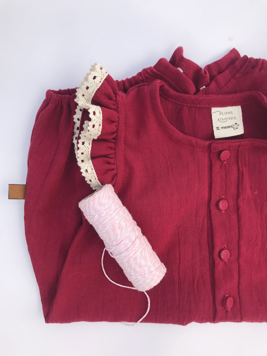 Confeccionado en gasa de algodon y tela simil jean, con detalle de botones forrados al tono y puntillita de algodón en las manguitas.